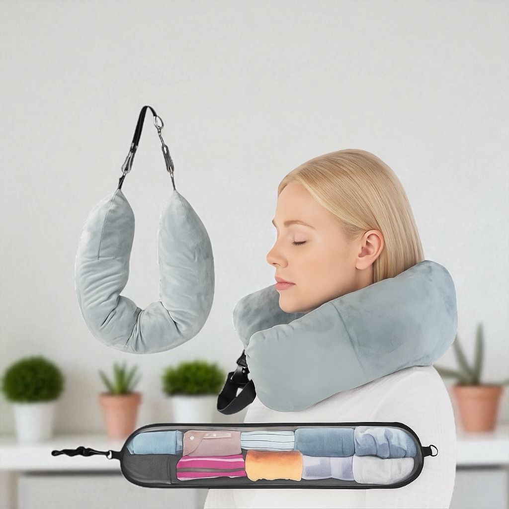 This velvet neck pillow combines soft comfort with practical storage, giving you extra space for your travel essentials while keeping your neck supported. Lightweight, adjustable, and perfect for every journey.
